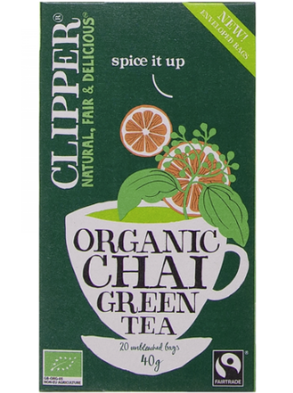 Описание продукта - легкий и освежающий зеленый чай тщательно смешивается с традиционными индийскими чайными ингредиентами: согревающей корицей, кардамоном и гвоздикой. Зеленый чай, выращенный на экологически чистых фермах в Индии и Китае, смешанный и упакованный на фабрике Clipper на юге Англии.