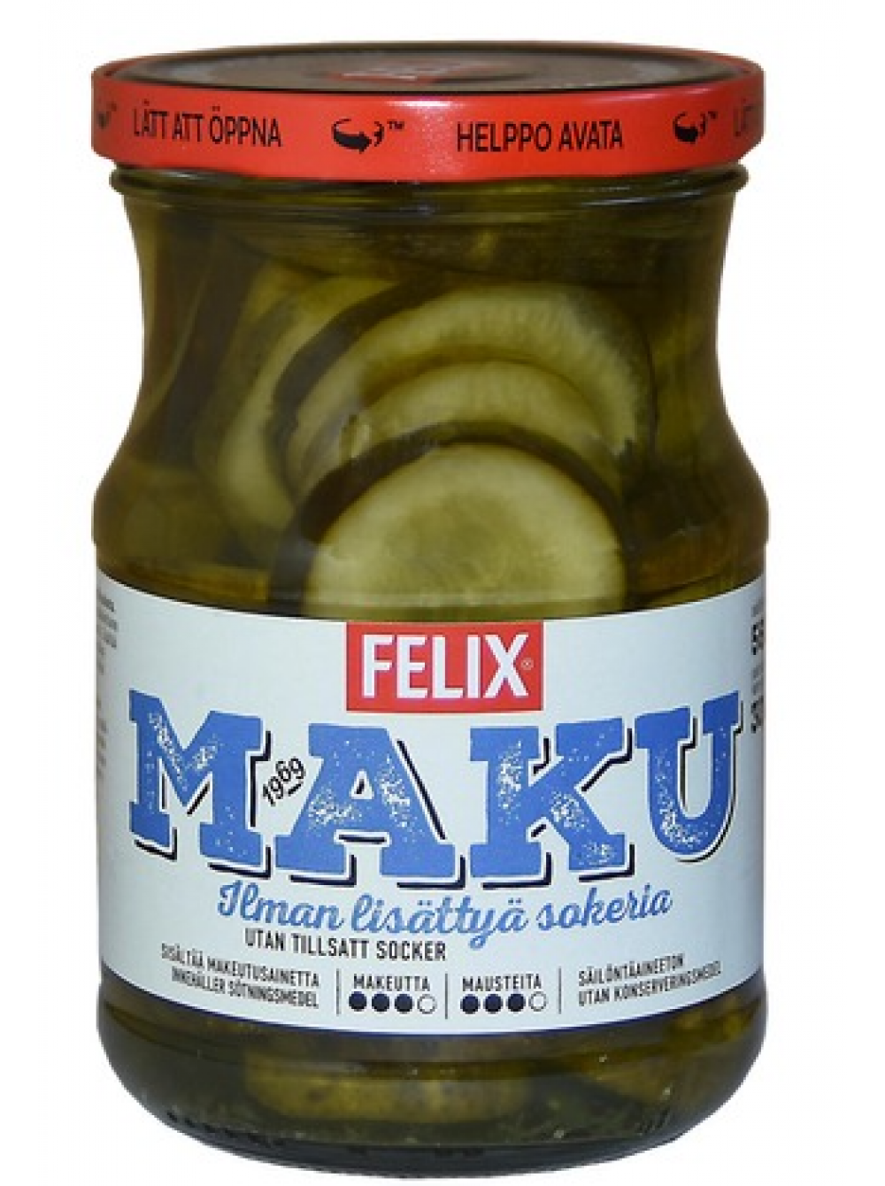 | Вид | Резанные огурцы в специях без добавления сахара Felix Maku Viipaloituja Kurkkuja Sokeria 560 / 300 г |