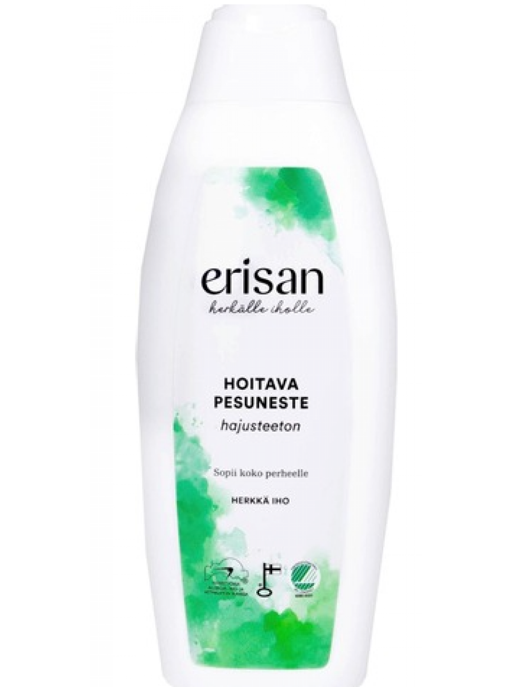 Erisan Nourishing Cleanser бережно очищает чувствительную кожу всей семьи. В составе жидкости используются проверенные и безопасные ингредиенты, которые заботятся о чувствительной коже и защищают ее, а также поддерживают нормальный водный баланс кожи. Изделие подходит для частой мойки. Продукт был разработан в сотрудничестве с Ассоциацией аллергии, кожи и астмы и не содержит отдушек, красителей и парабенов. Изделие произведено в Финляндии.
