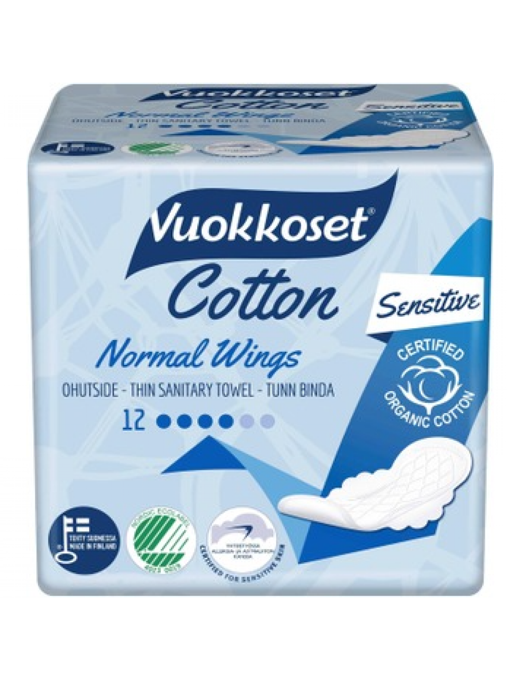 Vuokkoset Cotton Normal Wings - это нежная тонкая прокладка с крыльями, обладающая отличной впитываемостью.Разработана специально для чувствительной кожи. Поверхность повязки изготовлена из натурального 100% органического хлопка, что делает их особенно приятными на ощупь и дышащими по отношению к вашей коже. Узкая конструкция и профилированные крылья надежно удерживают защиту на месте и предотвращают утечку по краям. Vuokkoset Cotton - первая линейка товаров женской гигиены, отмеченная логотипом Ассоциации аллергии и астмы