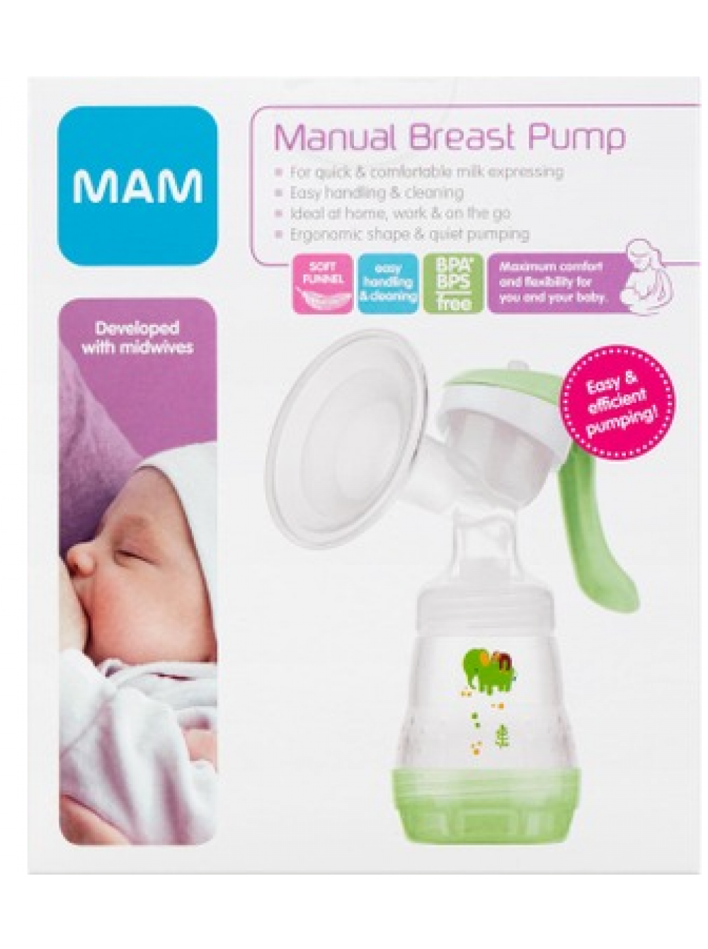 Удобное и легкое сцеживание с помощью ручного молокоотсоса MAM Manual. Помпа проста в сборке, и молоко можно с гигиенической точки зрения закачивать прямо в детскую бутылочку Ainu MAM Easy Start, откуда его легко кормить ребенка. Если молоко будет использоваться только позже, к молокоотсосу можно приложить раствор для хранения, и молоко можно будет с гигиенической точки зрения закачивать прямо в него. В растворе для хранения молоко можно легко хранить в холодильнике или при необходимости заморозить. Нагрудную чашу можно использовать со съемной мягкой силиконовой насадкой или без нее. Силиконовая насадка делает это особенно легко при первом сцеживании или с небольшими сосками. Сам сундук зафиксирован и не может быть снят с насоса, что делает сундук устойчивым