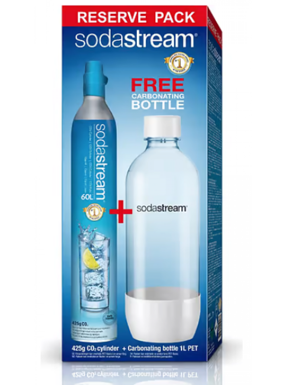 Баллон с углекислым газом содержит пищевой углекислый газ (CO2). Цилиндр создает пузырьки в водопроводной воде с помощью SodaStream. Из одного баллона с углекислым газом получается около 60 литров пузырьковой воды, в зависимости от температуры воды и количества пузырьков, которые вы добавляете в напиток. В этот комплект входит баллон с углекислым газом и литровая бутылка для питья.