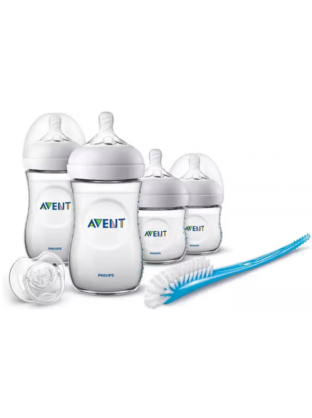Прозрачная белая соска, входящая в стартовый комплект, изгибается и следует естественному развитию рта, зубов и десен ребенка. Все пустышки изготовлены из силикона и не имеют вкуса и запаха. Изогнутая щетка и форма ручки помогают эффективно чистить бутылочки с широким горлышком, пустышки и кормушки.
