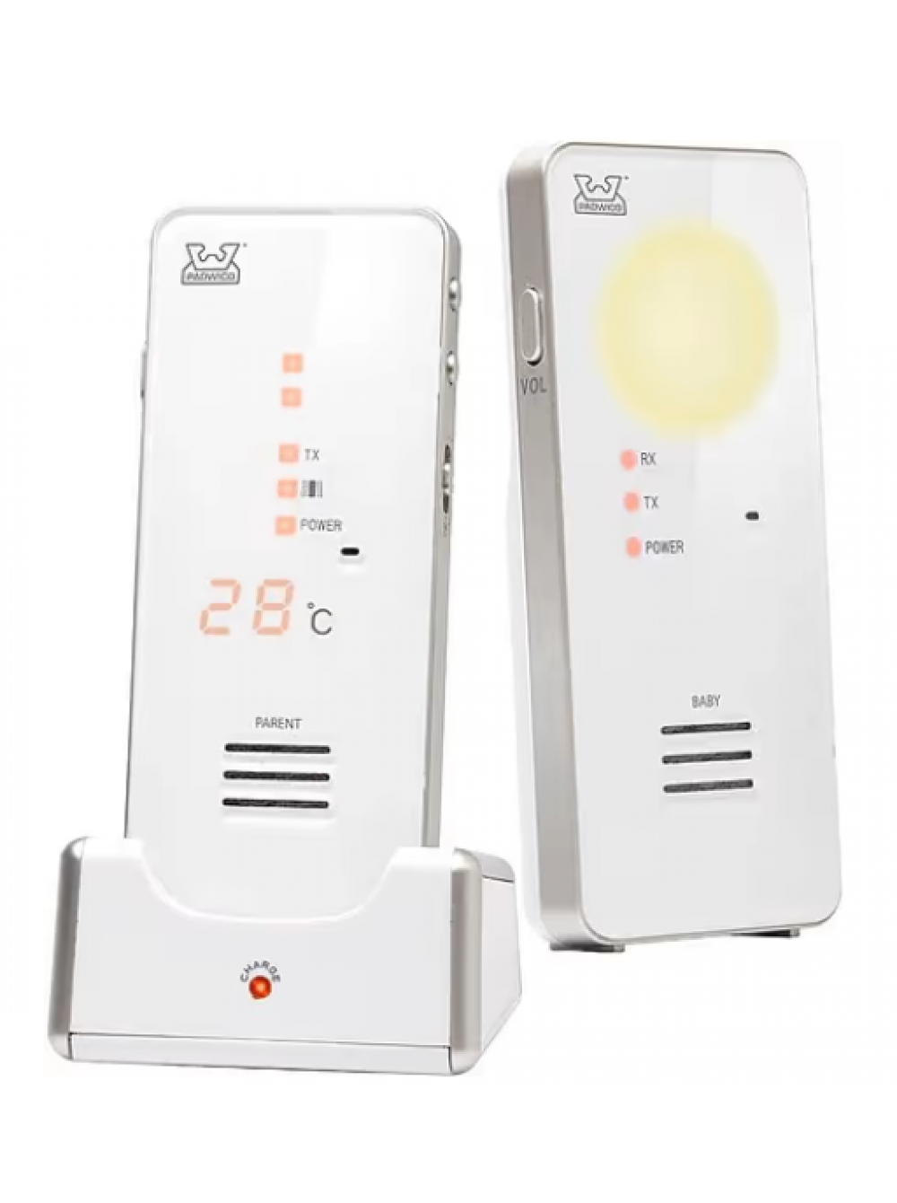 Подзаряжаемый детский и родительский блоки можно с помощью беспроводной связи разместить на прикроватной тумбочке или полке и снова вернуть на зарядную док-станцию, когда индикатор заряда батареи предупредит о низком уровне заряда. Детский блок измеряет температуру в помещении и при необходимости включается как ночник. Помимо традиционного звукового индикатора, родительский блок имеет виброзвонок, функцию двусторонней голосовой связи и ЖК-дисплей для контроля температуры.