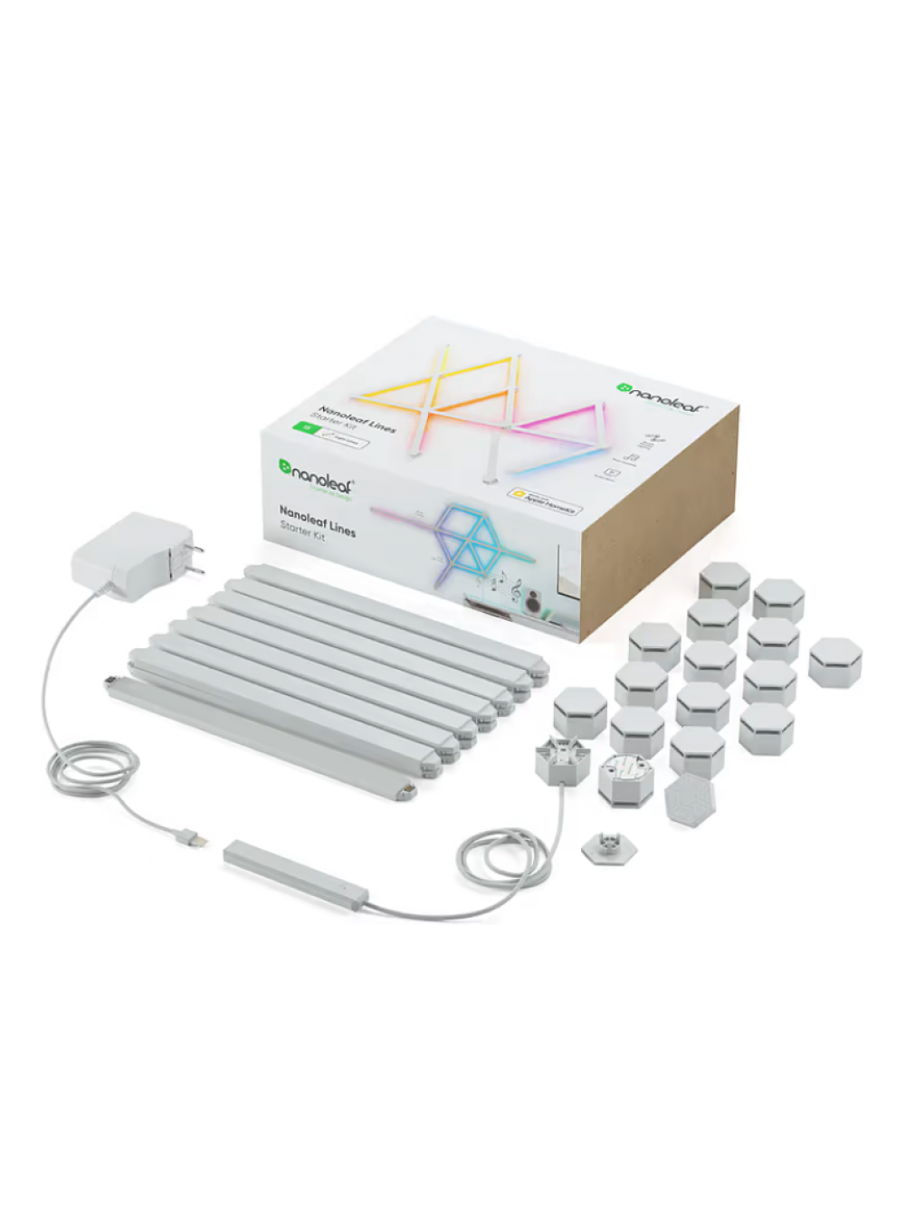 - Стартовый комплект с 15 планками, 15 шестигранными монтажными соединителями, 16 монтажными пластинами с наклейками, блоком управления и адаптером гнезда с кабелями