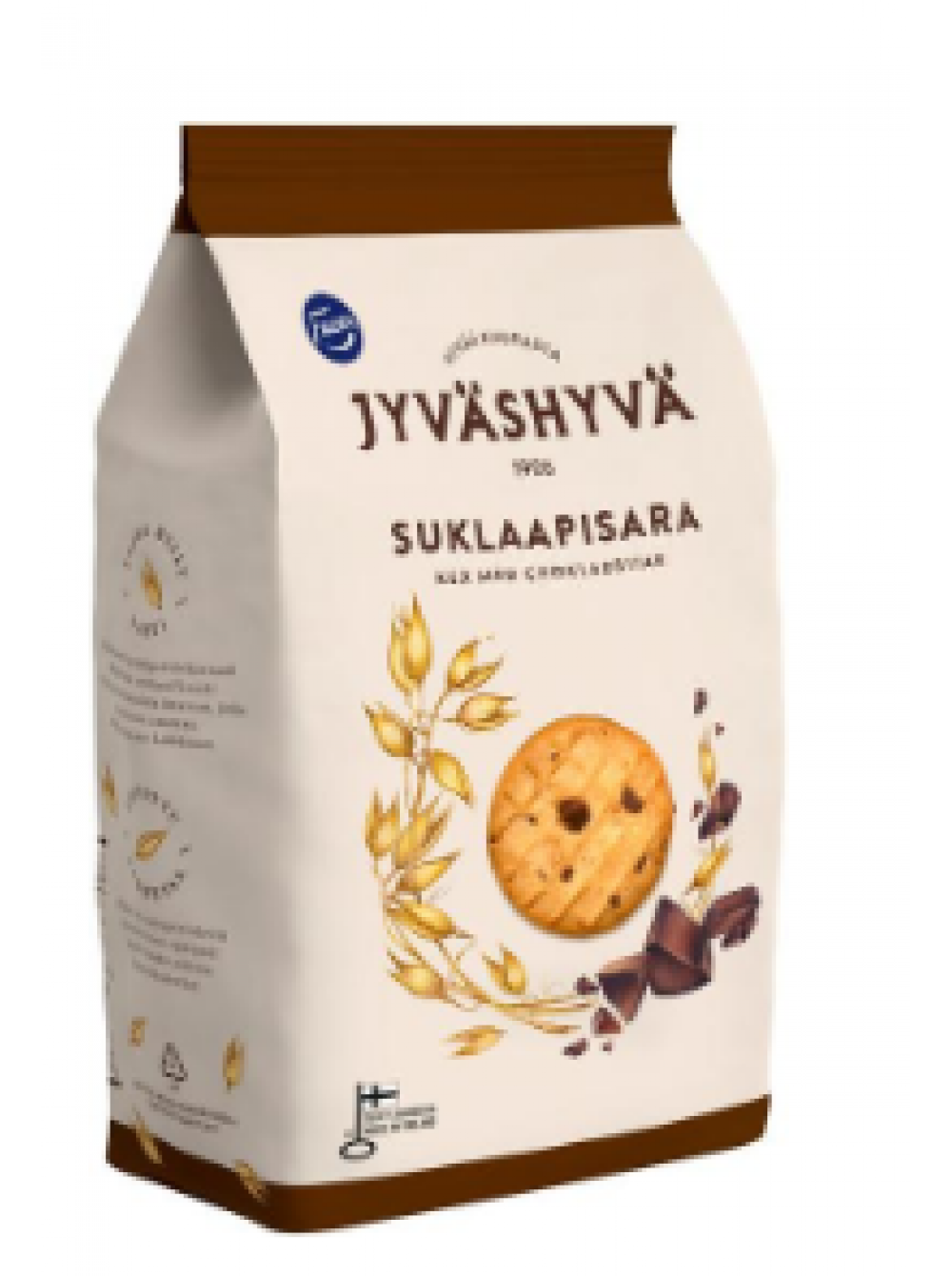 Jyväshyvä Suklaapisara – любимое печенье семей с детьми. Идеально зернистое печенье раскрывает вкусные шоколадные кусочки с каждым кусочком. Лучше всего печенье выпекается без пальмового масла. Большой упаковки вкусного печенья хватит и взрослым, и детям.