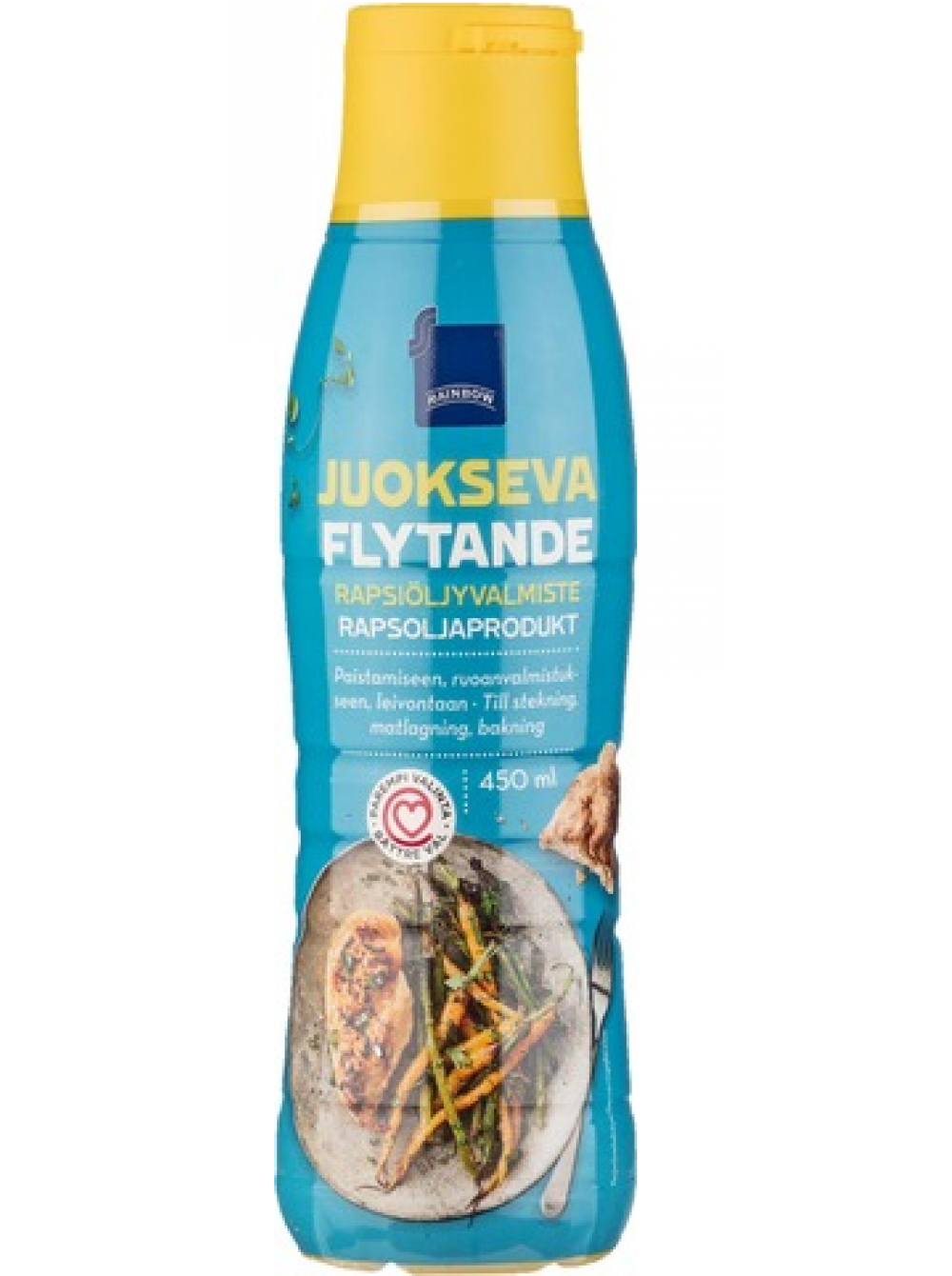 Жидкое рапсовое масло Rainbow отлично подходит для жарки и приготовления блюд, а также для различных видов выпечки и смазывания форм. 1,1 дл жидкого рапсового масла Rainbow эквивалентно примерно 100 г маргарина для выпечки. Препарат на основе жидкого рапсового масла Rainbow содержит 80% жира.