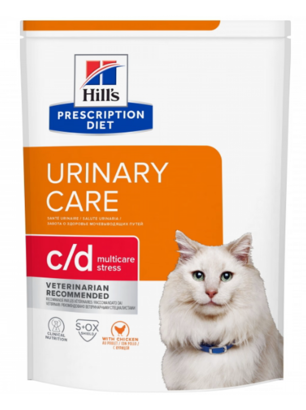 Клинически доказано, что корма для лечения мочевого стресса уменьшают рецидив симптомов кошачьего идиопатического цистита на 89%. Корма содержат L-триптофан и гидролизат молочного белка, которые контролируют стресс, который, как известно, является фактором риска идиопатического цистита кошек. Было изучено, что продукты серии Prescription Diet c/d растворяют струвитные камни всего за 14 дней. DL-метионин присутствует в качестве агента, подкисляющего мочу.