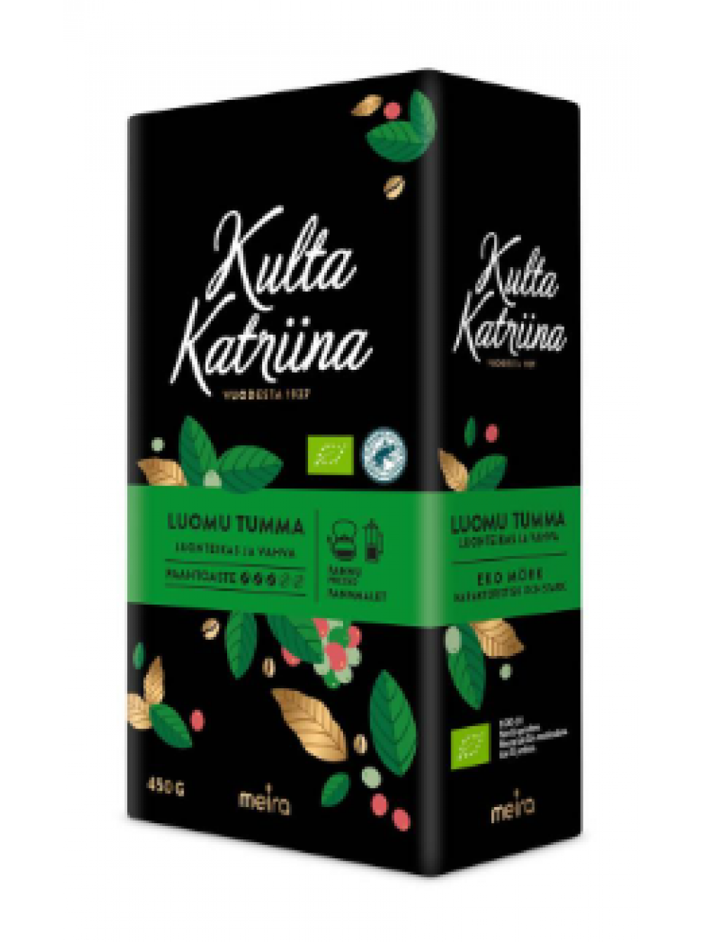 Kulta Katriina Luomu Tummapaahto — это органически произведенный кофе, высококачественные зерна которого созрели в Центральной Америке и Восточной Африке без искусственных удобрений. Кофе имеет характерный сильный и ароматный вкус и степень обжарки 3, то есть темную