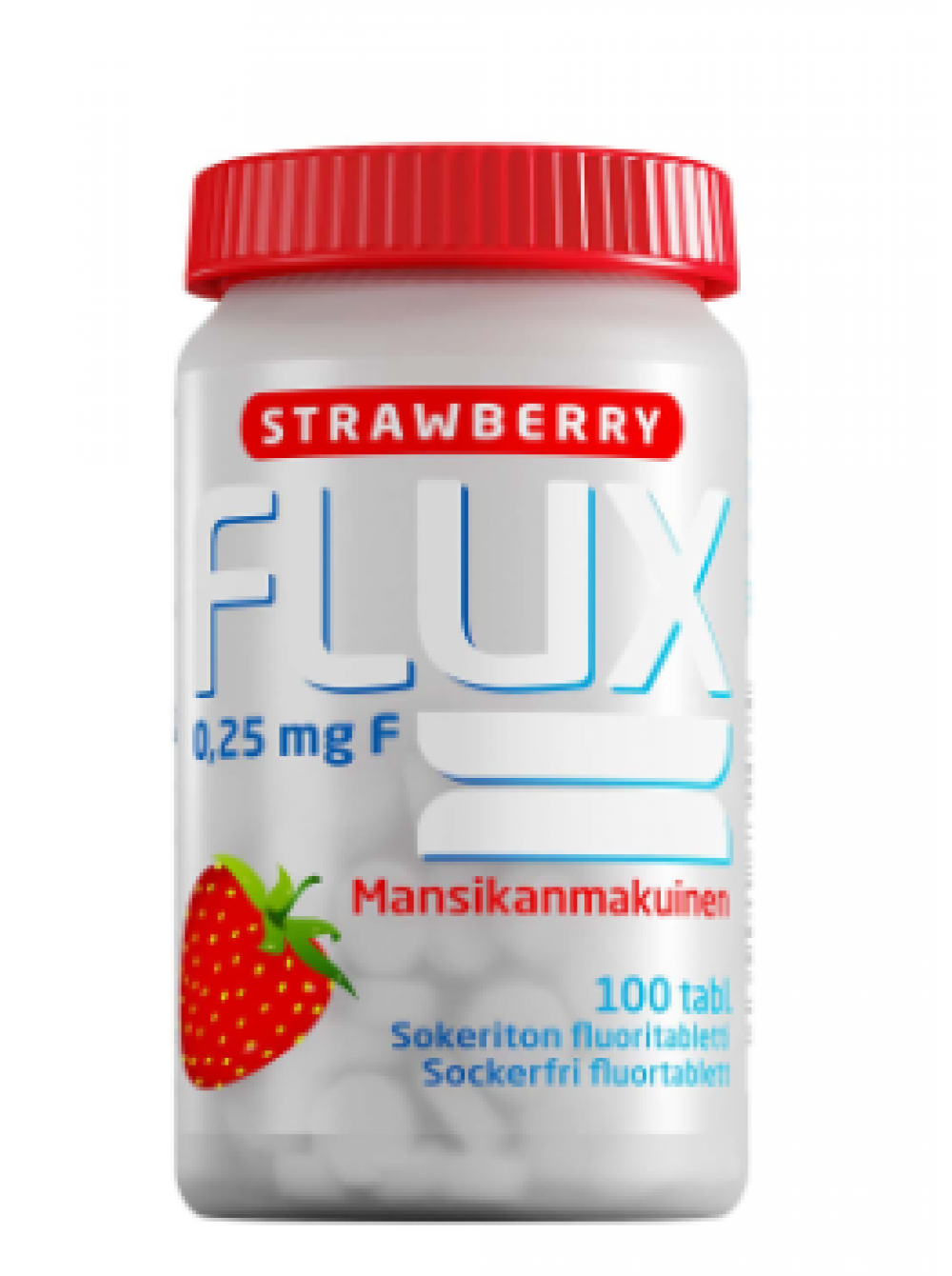 Не содержащие сахара сочные леденцы со вкусом клубники. Flux Strawberry Fluoride Tablets содержит фторид (0,25 мг F), который помогает поддерживать минерализацию зубов, то есть уменьшает кариес, предотвращая минерализацию зубной эмали. Фторидная добавка подходит, например, для пользователей-ортодонтов, частичных зубных протезов, сухих струпьев или лиц с повышенным риском развития кариеса.