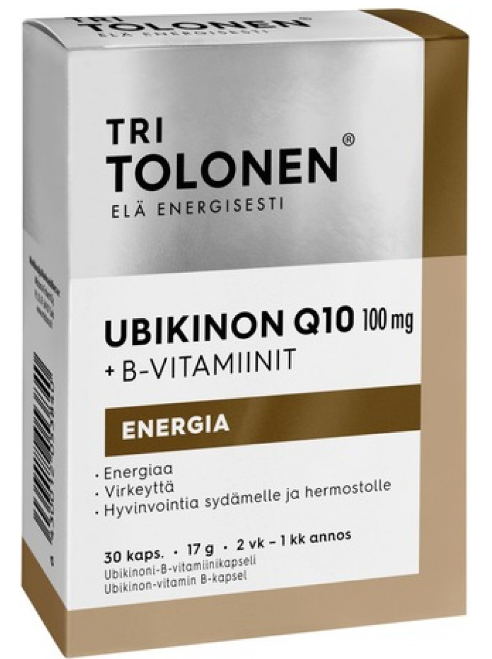 Энергия и свежесть! Капсулы Dr. Tolonen Ubiquinone с витамином B могут компенсировать снижение выработки убихинона, вызванное старением. Убихинон, или коэнзим Q10, представляет собой витаминоподобное соединение, которое содержится во всех клетках организма. Его производство резко снизится примерно с 30 лет. Содержит витамины группы В, тиамин и рибофлавин, которые способствуют нормальному энергетическому обмену. Рибофлавин помогает защитить клетки от окислительного стресса и помогает снизить усталость и истощение. Тиамин способствует нормальному функционированию сердца и нервной системы. Рекомендуемая суточная доза - 1 капсула. Добавка не заменяет разнообразное и сбалансированное питание или здоровый образ жизни.